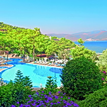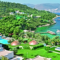 расположен в 25 км от аэропорта и в 10 км от центра Бодрума, в 2 км от поселка Торба, на берегу моря.